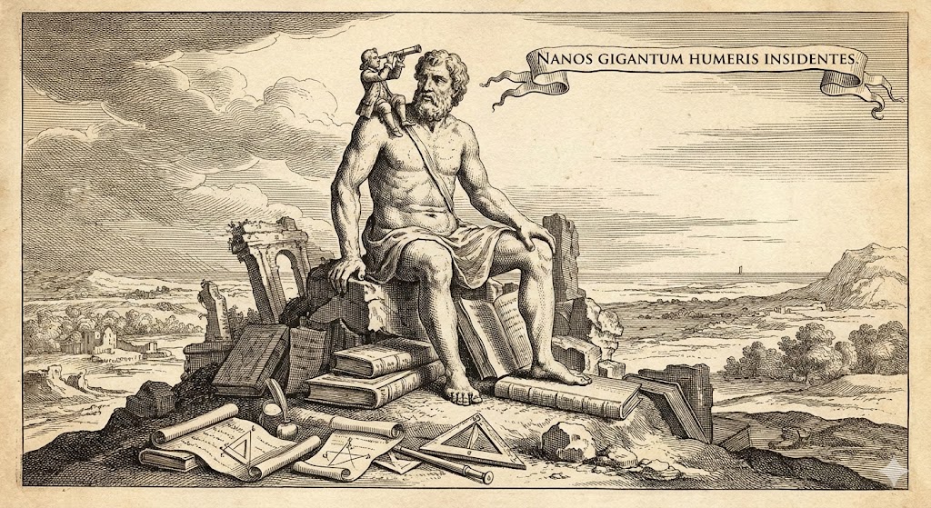 I am currently working on the visual elements. My focus is now on the central figures: a stone giant on a rugged hill with a dwarf, clad in antique garb, perched on its shoulder, peering through a telescope. The landscape will include ancient libraries and ruins symbolizing accumulated knowledge and a distant, uncharted expanse as the dwarf’s viewpoint. I’m aiming for a Renaissance print aesthetic, with an etched texture, sepia tones, and meticulous detail, and will include the Latin phrase “NANOS GIGANTUM HUMERIS INSIDENTES” on a banner.