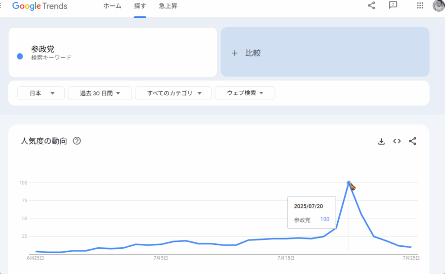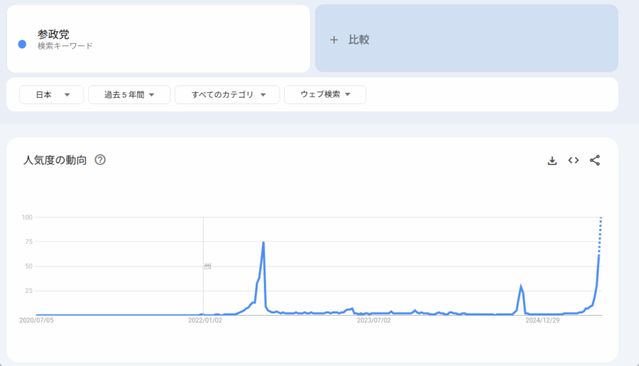 参政党 – 調べる – Google トレンド https://trends.google.co.jp/trends/explore?date=today%205-y&geo=JP&q=%E5%8F%82%E6%94%BF%E5%85%9A&hl=ja