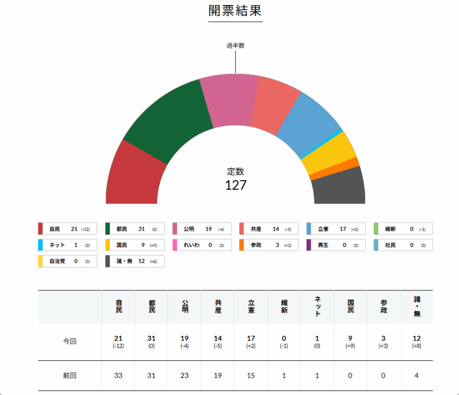 都議会議員選挙(令和7年6月22日執行) 開票結果|都議会議員選挙(令和7年6月22日執行) 投開票結果|東京都選挙管理委員会 https://www.senkyo.metro.tokyo.lg.jp/election/togikai-all/togikai-sokuhou2025/result