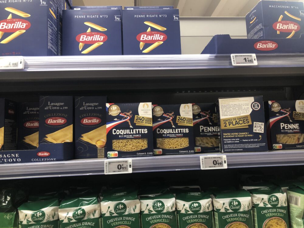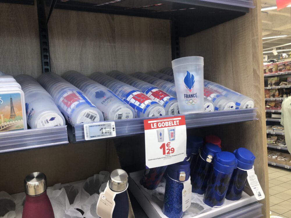 たまに日本に帰国すると、観光地に似たようなお土産物や食べ物屋が何軒も並び、山の休憩場にまで自動販売機が立つ状況を見て、商売やりすぎとうんざりした感じがする私ではあるが、こう商売っ気がないフランスのスーパーを見ると、私が店長だったら、オリンピック関連商品は一番目立つ場所にまとめて並べたり、チラシを作って宣伝するのになあなどと思ってしまう。